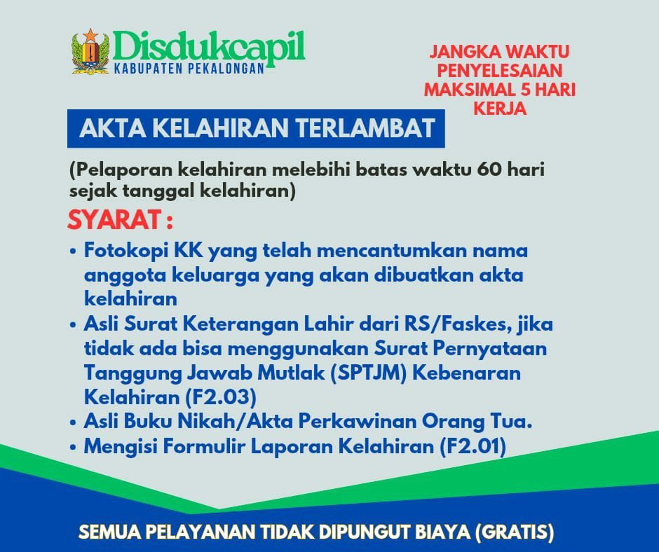 Lalu apakah bisa dikenai denda ? Sesuai Undang-undang Nomor 23 Tahun 2006 bisa dikenai denda yang besarannya selanjutnya diatur dalam Peraturan Daerah masing-masing. Namun untuk Pemerintah Kabupaten Pekalongan keterlambatan pelaporan kelahiran sesuai Peraturan Daerah Nomor 6 Tahun 2016 tentang Penyelenggaraan Administrasi Kependudukan, tidak dikenai denda administratif.